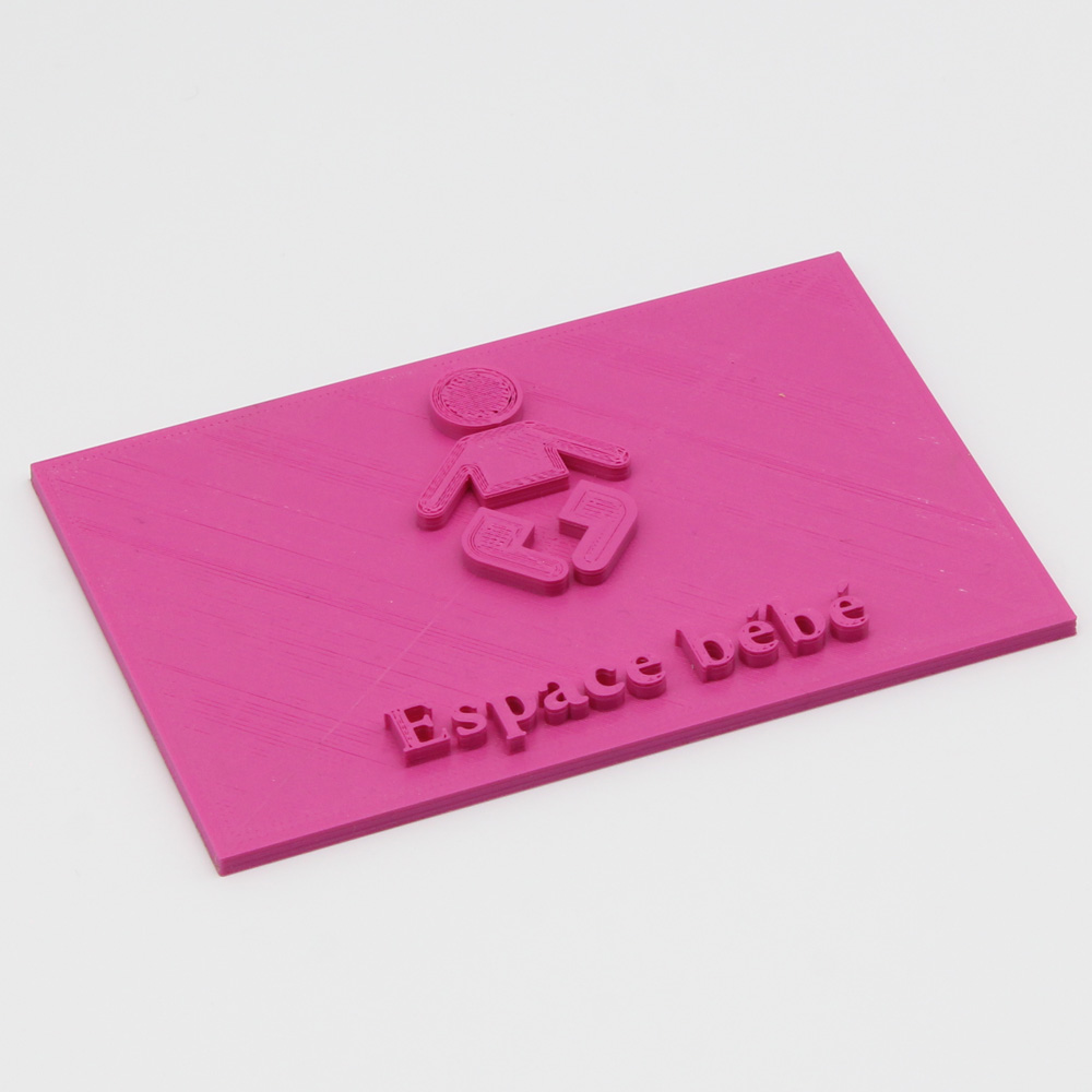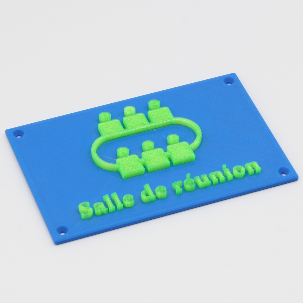 Plaque de porte avec texte et symbole en relief personnalisable.
