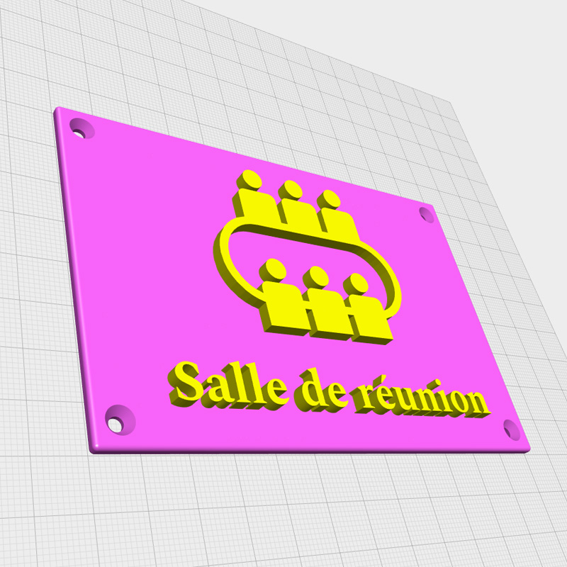 Paramètre : longueur, largeur, hauteur, bord arrondi, fixation, symbole, texte, police, couleur, matière,…